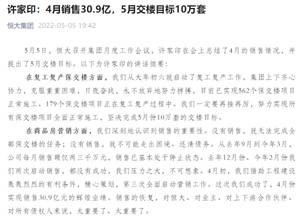 5月5日,恒大召开集团月度工作会议,许家印表示,恒大从大年初六就启动了复工复产工作,集团上下齐心协力,目前已实现562个保交楼项目正常施工、179个保交楼项目正在复工复产过程中。4月份实现销售30.9亿元,坚决完成5月份10万套的交楼目标。