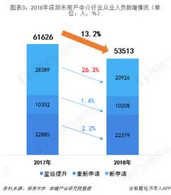 随着2018年市场调整,2017-2018年,行业从业人员的整体情况也发生变化,新增从业人员明显减少。据深房中协数据,与2017年新增61626名中介从业人员相比,2018年新增人员同比减少13.2%,下降至53513人。从新增人员结构来看,对比星级提升、重新申请,新申请人员降幅最为明显,高达26.3%。
