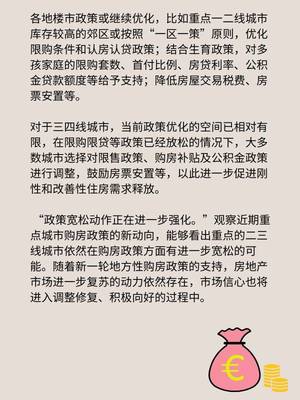 各地楼市政策或继续优化,比如重点一二线城市库存较高的郊区或按照“一区一策”原则,优化限购条件和认房认贷政策;结合生育政策,对多孩家庭的限购套数、首付比例、房贷利率、公积金贷款额度等给予支持;降低房屋交易税费、房票安置等。