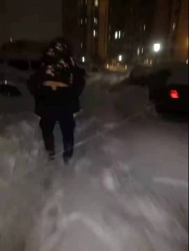 图:海城碧桂园物管领班孙维维在雪夜中身背业主前行(来源:企业供图)