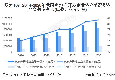 2014-2020年期间,我国房地产开发企业资产规模呈现逐年上升的趋势,2018年突破80万亿元,与此同时,资产负债率也处于持续上升的态势之中,由2014年77%的负债率上升至2020年80.7%。