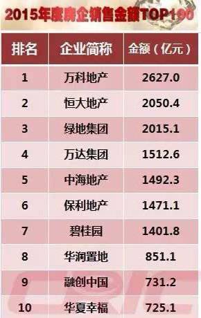 如此,造成的结果就是,大企业越做越大,小企业濒临破产,行业集中化逐步显现,行业结构化调整加剧,未来会出现少数几家地产寡头。重庆市市长黄奇帆前段时间就公开发声:黄奇帆:重庆将在未来3年关闭1500家房地产公司,说的就是这个逻辑。我们再来看中国前十强房企的销售业绩情况也能说明这一点: