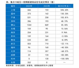据中指研究院数据显示,2023年五一期间(4月29日-5月3日),代表城市成交规模较去年五一假期增长约25%,其中多个城市受低基数影响,同比增幅较大,但整体较2019年同期降幅仍超过20%。