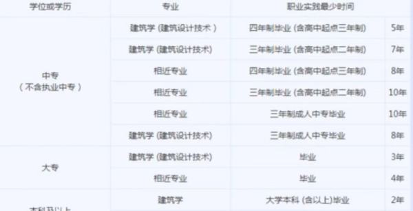 3、具有建筑学专业大学本科毕业学历并从事建筑设计或者相关业务5年以上的,或者具有建筑学相近专业大学本科毕业学历并从事建筑设计或者相关业务7年以上的。