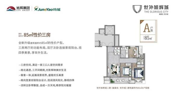 世外旭辉城(备案名:世外城)二期推出建筑面积约85㎡的刚需舒居户型。