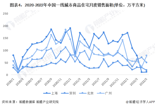 通过观测2020-2022年中国一线城市商品住宅月度销售面积,四个城市的成交量走势较为一致。自2022年以来,一线城市销量呈现下滑趋势,目前销售面积处于历史低位。2022年5月,广州实现77.71万平方米销售,环比增长超过100%;上海自疫情管控有所改善后,商品住宅销量有小幅回升;受疫情复发的影响,北京销量数据仍呈下降趋势;深圳销量数据也继续下探。