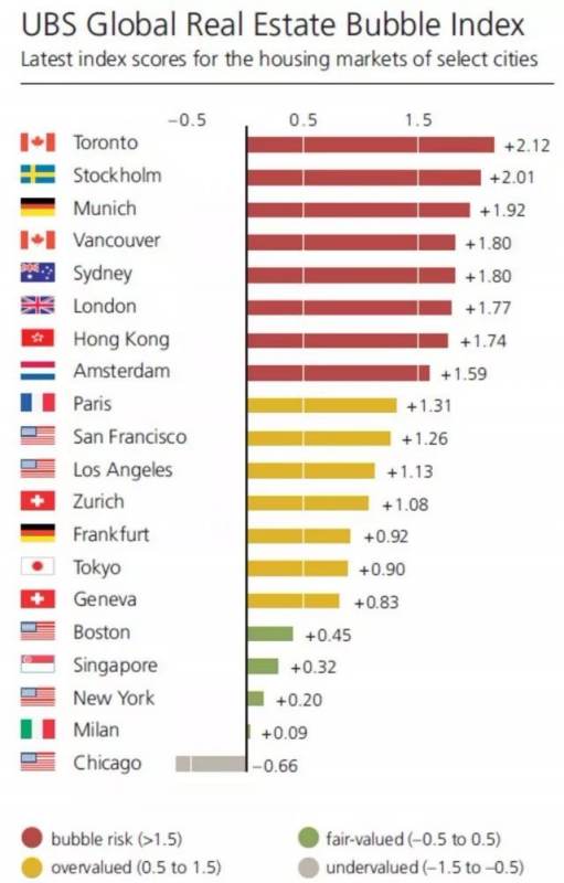 多伦多:在瑞银的报告中,多伦多的泡沫风险指数高达2.12,名列全球第一。在过去5年,这个加拿大城市的平均房价比2011年上涨了近50%,泡沫风险急剧上升。