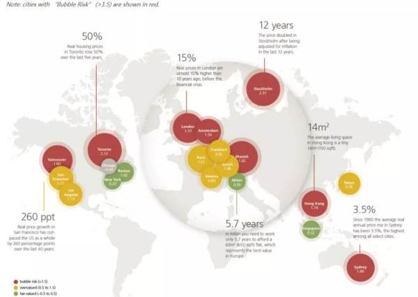 瑞银集团提醒,世界上有一些城市的房价攀升速度已经呈现出潜在的不可持续状态,其中有八座城市面临泡沫风险,图中以红色标出。