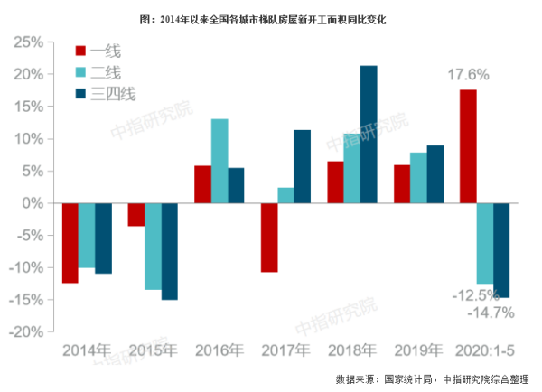 三四线城市:部分城市需求已存在透支,加之2020年棚改力度进一步减弱,需求持续性较弱,下半年销量或将存压,房企投资也将较为谨慎,开工或保持调整。