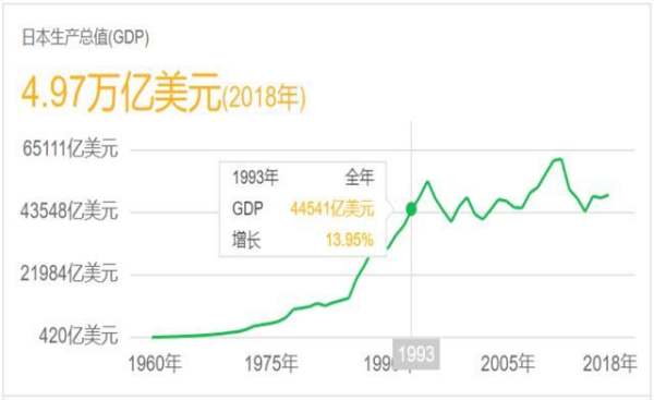 可见,1993年以后直至2018年统计时点,日本的国内生产总值GDP一直在4.4万亿美元上方高位震荡,以往高速发展的趋势在打压下被扭转。