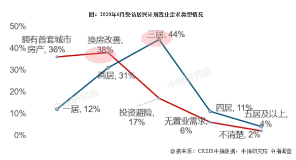 从30个城市住宅项目销售套数占比情况来看,2020年1-5月,120-144平米、144-200平米之间和200平米以上的改善型产品销售套数较2019年均有所增多,居住需求不断升级。根据最新中指百城居民置业意愿调查结果显示,6月,近四成受访者表示短期购房需求为换房改善,改善型需求占据重要地位。此外,受当前城市居民居住特征影响,各类置业群体也更为偏好三居类中大户型产品,此类产品需求占比为44%,明显高于其他类型。预计随着疫情影响不断减弱,市场换房需求仍存较大释放空间,且在限购等政策影响下,部分购房者更倾向选择一步到位的产品,中高端项目成交占比有望继续上升。