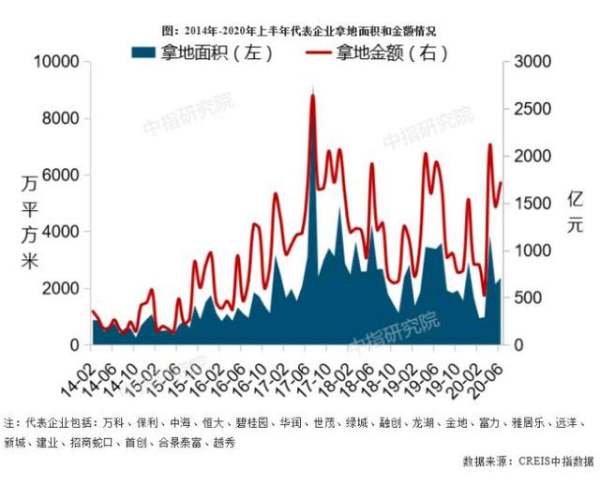 企业拿地力度下降,二季度拿地积极性明显回升。2020年上半年,20家品牌房企累计拿地12063万平方米,同比下降26.5%;累计拿地金额7547亿元,同比下降11.0%。具体来看,一季度受疫情影响,部分城市推地节奏放缓或暂停,企业拿地规模明显下降;4月以来,在市场置业信心逐渐恢复、各地优质地块推出量增加以及资金面略有改善等因素影响下,20家品牌房企调整拿地节奏,拿地积极性明显提升,二季度代表企业拿地金额、面积环比增幅均翻番。