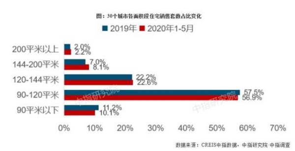 从30个城市住宅项目销售套数占比情况来看,2020年1-5月,120-144平米、144-200平米之间和200平米以上的改善型产品销售套数较2019年均有所增多,居住需求不断升级。根据最新中指百城居民置业意愿调查结果显示,6月,近四成受访者表示短期购房需求为换房改善,改善型需求占据重要地位。此外,受当前城市居民居住特征影响,各类置业群体也更为偏好三居类中大户型产品,此类产品需求占比为44%,明显高于其他类型。预计随着疫情影响不断减弱,市场换房需求仍存较大释放空间,且在限购等政策影响下,部分购房者更倾向选择一步到位的产品,中高端项目成交占比有望继续上升。
