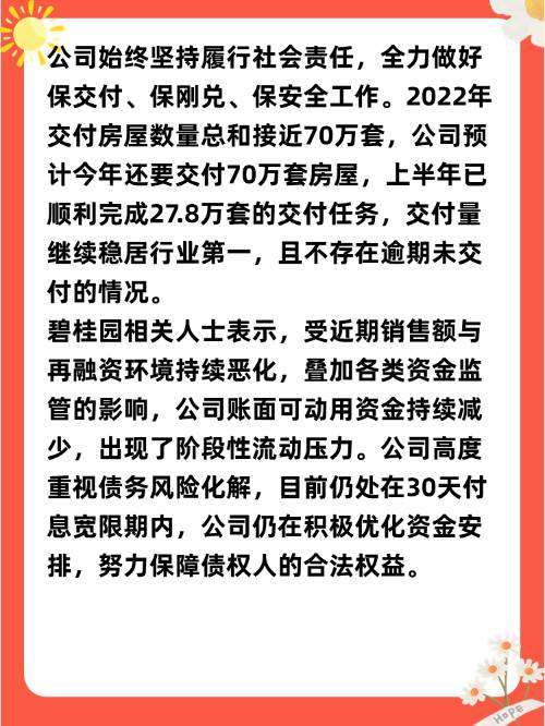 碧桂园相关人士表示,受近期销售额与再融资环境持续恶化,叠加各类资金监管的影响,公司账面可动用资金持续减少,出现了阶段性流动压力。公司高度重视债务风险化解,目前仍处在30天付息宽限期内,公司仍在积极优化资金安排,努力保障债权人的合法权益。