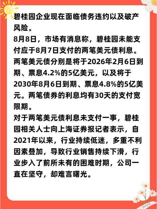 对于两笔美元债利息未支付一事,碧桂园相关人士向上海证券报记者表示,自2021年以来,行业持续低迷,多重不利因素叠加,导致行业销售持续下滑,行业步入了前所未有的困难时期,公司一直在坚守,却难言曙光。