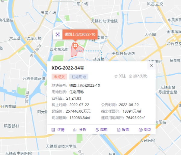 XDG-2022-10号地块(锡国土(经)2022-17)以77921万元的成交价、12030元/平方米的成交楼面价、0.26%的溢价率由无锡城建发展集团竞得。