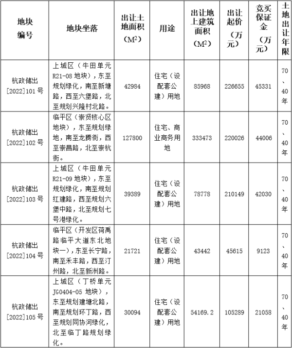 本批次共推出5宗涉宅地块,其中3宗位于上城区、2宗位于临平区。5宗地块总土地出让面积261988平方米,挂牌起始总价80.77亿元。5宗地块将于2023年2月7日集中出让。