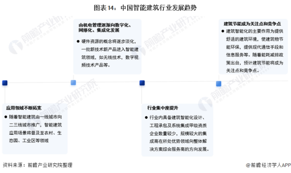 我国智能建筑起源于20世纪90年代,在我国发展了二十年,行业经历了初创期、规范期、发展期三个阶段,已经形成了产业规模及产业链,智能建筑工程已经普及到了各种类型建筑并延伸到了城市建设及相关行业。预计未来,应用领域方面,智能建筑将由一线城市逐渐向二三线城市推广,普及农村、生态园、工业区等领域;技术上,由机电管理逐渐向数字化、网络化、智能化发展;企业竞争方面,规模较大企业在所处优势领域向整体解决方案综合服务商的方向发展;应用场景方面,随着能耗减排政策出台,预计建筑节能将成为关注点和竞争点。