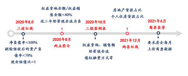 2020年8月20日, 住房城乡建设部、人民银行在北京召开重点房地产企业座谈会,会议上明确指出,为控制房地产企业有息债务的增长,设置“三道红线”,并对重点房企按照“红-橙-黄-绿”四挡管理,要求试点房企须在2023年6月30日前完成降负债目标。