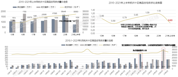 杭州上半年新房市场的整体表现,克而瑞研究总结为,政策的持续收紧,在打压市场投机行为的同时,加重了购房置业焦虑;2021年初热点项目集中开盘,供应量激增;5月官方数据对已完成销售的房源进行了销售状态调整,受此影响,5月成交量骤增。