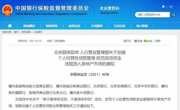 1月30日,北京银保监局发布消息称,要求各行对2020年下半年以来新发放的个人消费贷款和个人经营性贷款合规性开展全面自查,发现个人信贷资金违规流入房地产等问题,对银行机构从严顶格处罚。2月10日,北京银保监局发布 《关于加强个人经营性贷款管理 防范信贷资金违规流入房地产市场的通知》,要求严格实施贷前调查,尽职落实贷后管理。