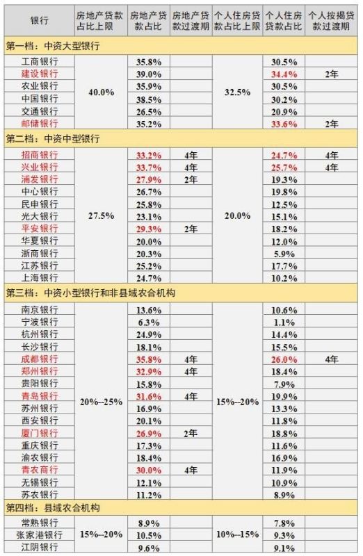 央行、银保监会根据银行业金融机构的资产规模、机构类型等因素,分档设定了房地产贷款集中度管理要求。总共分为五档,分别是中资大型银行、中资中型银行、中资小型银行和非县域农合机构、县域农合机构、村镇银行。