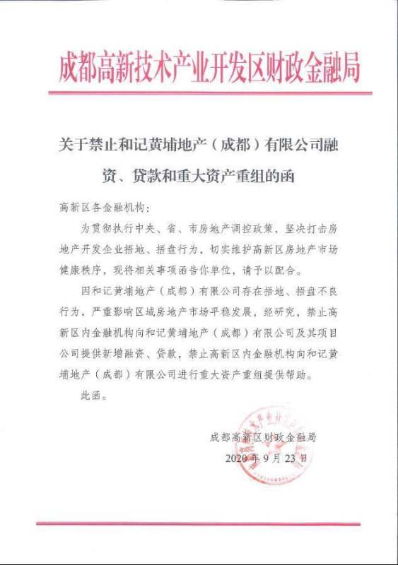 据知名财经媒体(澎湃新闻)发布的报道显示:有消息称,成都市高新区相关部门(财政金融局)向辖区内各金融机构下发函件,要求各机构禁止向存在捂地、捂盘行为的“和记黄埔地产(成都)有限公司”(简称“和记黄埔成都公司”)及其项目公司,提供新增融资和贷款;