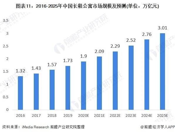2019年,我国长租公寓市场规模已经达到1.73万亿元。结合上述讨论,购房压力大、住房流动性频繁、新生一代购房观念的转变、长租公寓具有独特优势等,未来长租公寓市场发展前景广阔,2025年市场规模有望突破3万亿元。