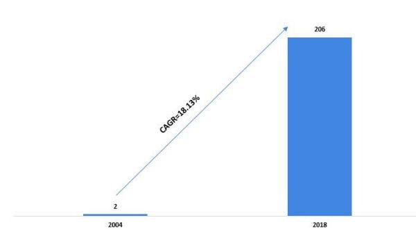 伴随房地产市场快速发展,经纪行业规模不断扩大。根据第四次经济普查结果显示,截至2018年末,全国共有房地产中介服务企业20.6万个,2004-2018年的复合年增长率达18.13%。