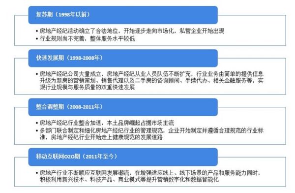 中国房地产经纪行业到目前为止一共经历了四个阶段:1998年之前的复苏期、1998-2008年的快速发展期、2008-2011年的行业整合与调整期、2011年至今的移动互联网和产业互联网融合发展阶段。