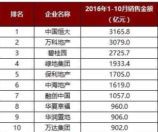 如此,造成的结果就是,大企业越做越大,小企业濒临破产,行业集中化逐步显现,行业结构化调整加剧,未来会出现少数几家地产寡头。重庆市市长黄奇帆前段时间就公开发声:黄奇帆:重庆将在未来3年关闭1500家房地产公司,说的就是这个逻辑。我们再来看中国前十强房企的销售业绩情况也能说明这一点: