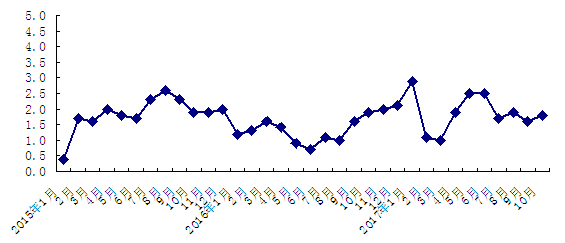 2015年以来北京市居民消费价格当月同比涨跌幅度(%)