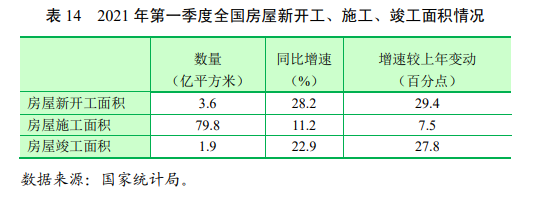 2021年第一季度,全国房价总体稳定。受上年低基数影响,商品房销售和房地产开发投资同比出现明显增长。3月,70个大中城市新建商品住宅和二手住宅价格同比分别上涨4.4%和3.3%,涨幅较上年末分别高0.7个和1.2个百分点。一季度,商品房销售面积同比增长63.8%,两年平均增长9.9%;销售额同比增长88.5%,两年平均增长19.1%。一季度,房地产开发投资同比增长25.6%,两年平均增长7.6%;其中,住宅开发投资同比增长28.8%,两年平均增长9.3%,占房地产开发投资的比重为74.8%。