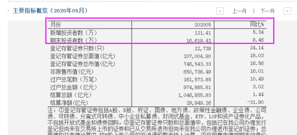 如上图,这是截止2020年5月份的数据,截止目前已经约有1.66亿投资者,同比上个月新增8.45%,5月份新增投资者数量为121.41万人,同比增长5.34%,这个数据都是同比大幅增长。