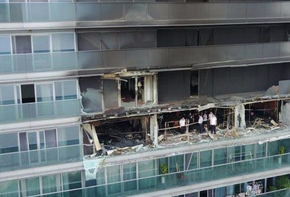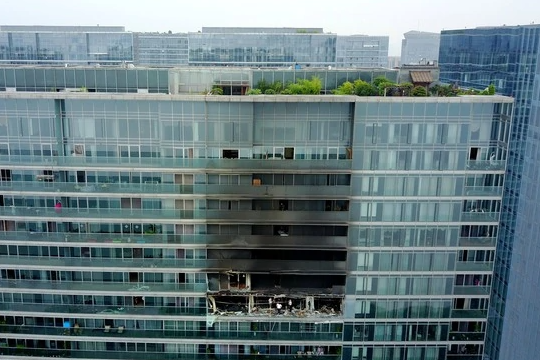 6月22日,航拍发生火灾的杭州蓝色钱江小区2幢1单元1802室,现场一片惨状。火灾导致该户女主人及3名小孩死亡。