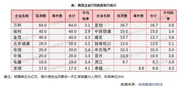 在融资成本方面,同策研究院高级分析师陈舒表示,7月融资成本范围在2%-7.13%;在已披露的数据中,融资成本最低的为招商蛇口发行的其他债权融资,融资金额约12.9亿元,票面利率约为2%;而融资成本高者为宝龙地产发行的公司债,融资金额约17.72亿元,票面利率为7.13%。