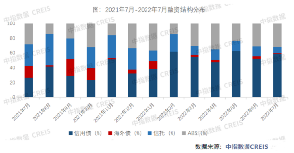 另据中指研究院7月融资月报显示,房地产企业非银融资总额为881.1亿元,同比下降56.7%,环比下跌3.1%。从融资结构来看,7月房地产企业信用债规模占比超过半数,海外债占比不到1%。