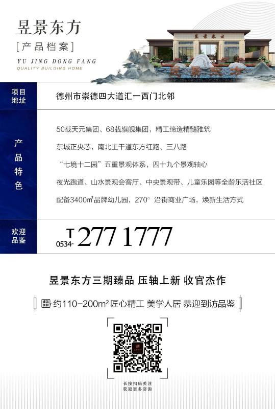 昱景东方吉屋售楼处热线:4006581350转45043。昱景东方,小区景观采用新亚洲园林设计手法,将传统意境与现代风格对称运用。超4万平米园林绿化面积,集喷泉水景、建筑雕塑、园林小品等景观元素于一体,五维景观设计,让业主尽享公园生活。社区内部配备运动跑道,健康生活即刻开启。昱景东方,择址东部新城央心,傲瞰城市未来,以恢宏气度鼎力造极,屹立未来城市封面。秉承公园生活居住理念,打造一席人居生活样板,90-220_人居样板,以革新城市的力量启幕万象生活,不负德州期待!昱景东方三期有1#、2#、8#、9#、14#、15#(共6栋)楼,其中1#、2#楼为18层,一梯两户;8#楼为27层,一梯两户;9#楼为18层,一梯两户;14#、15#楼为33层,一梯两户。昱景东方,择址东部新城央心,傲瞰城市未来,以恢宏气度鼎力造极,屹立未来城市封面。秉承公园生活居住理念,打造一席人居生活样板,建面约90-220_人居样板,以革新城市的力量启幕万象生活,不负德州期待!昱景东方一期销售完毕,二期新品建面约90-130_力作即将面市,敬请期待!道路交通:德州市经济开发区三八东路与崇德四大道交汇处南行200米周边商业:澳德乐时代广场周边景观:长河公园周边交通:107路;112路周边公园:长河公园周边医院:德州市人民医院开发区分院袁桥镇卫生院周边学校:东城中学;杨庄小学,袁桥幼儿园、杨庄小学、袁桥乡中心小学周边幼儿园:社区配套幼儿园内部配套:13000平米商业街、高档会所、3400多平米双语幼儿园