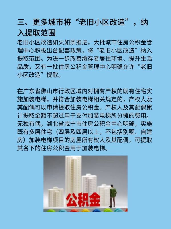 除了扩大提取范围,将“老旧小区改造”纳入提取范围,一些城市还积极做好住房公积金提取政策适时调整,方便职工提取。