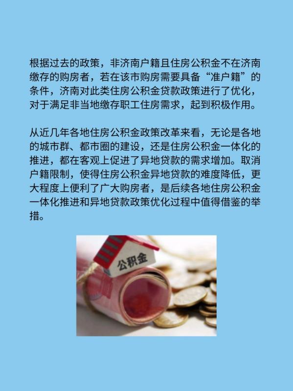 根据过去的政策,非济南户籍且住房公积金不在济南缴存的购房者,若在该市购房需要具备“准户籍”的条件,济南对此类住房公积金贷款政策进行了优化,对于满足非当地缴存职工住房需求,起到积极作用。
