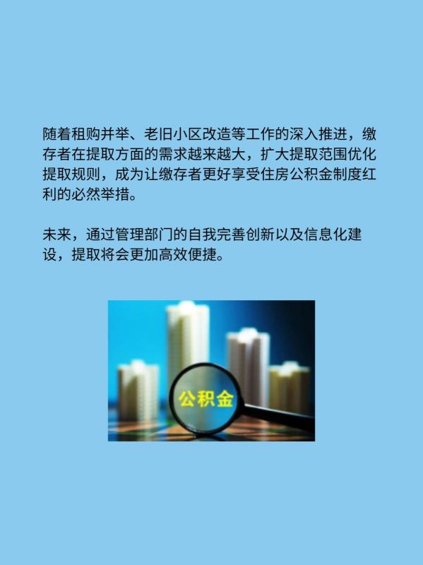 随着租购并举、老旧小区改造等工作的深入推进,缴存者在提取方面的需求越来越大,扩大提取范围优化提取规则,成为让缴存者更好享受住房公积金制度红利的必然举措。