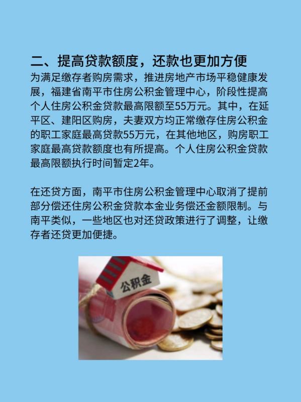 为满足缴存者购房需求,推进房地产市场平稳健康发展,福建省南平市住房公积金管理中心,阶段性提高个人住房公积金贷款最高限额至55万元。其中,在延平区、建阳区购房,夫妻双方均正常缴存住房公积金的职工家庭最高贷款55万元,在其他地区,购房职工家庭最高贷款额度也有所提高。个人住房公积金贷款最高限额执行时间暂定2年。