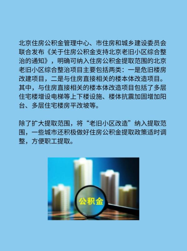 北京住房公积金管理中心、市住房和城乡建设委员会联合发布《关于住房公积金支持北京老旧小区综合整治的通知》,明确可纳入住房公积金提取范围的北京老旧小区综合整治项目主要包括两类:一是危旧楼房改建项目,二是与住房直接相关的楼本体改造项目。其中,与住房直接相关的楼本体改造项目包括了多层住宅楼增设电梯等上下楼设施、楼体抗震加固增加阳台、多层住宅楼房平改坡等。