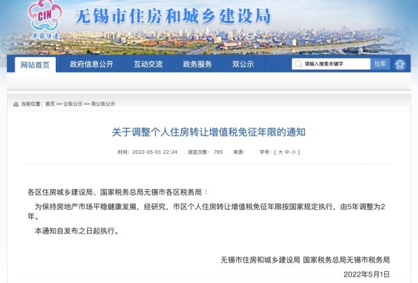 无锡市住房和城乡建设局在5月1日下发了《关于调整个人住房转让增值税免征年限的通知》。