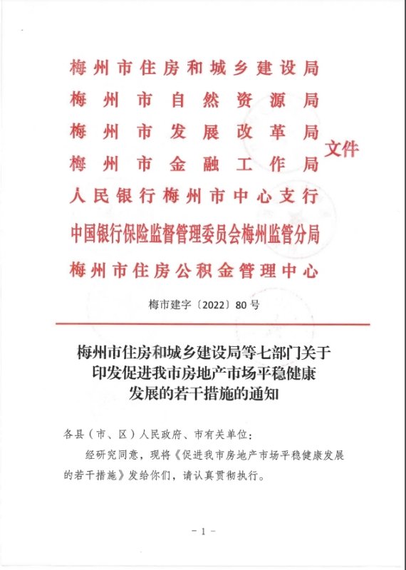 据广东省梅州市人民政府网站5月1日消息,梅州市住房和城乡建设局等七部门关于印发促进该市房地产市场平稳健康发展的若干措施的通知。