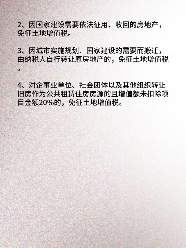4、对企事业单位、社会团体以及其他组织转让旧房作为公共租赁住房房源的且增值额未扣除项目金额20%的,免征土地增值税。