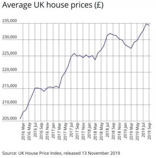 房价在2016年6月的全民公投之后确实停滞了一段时间,如上图所示。在接下来的几个月里,价格普遍有所上涨,这种情况在2017年再次出现。但是,随着英国脱欧的临近,房价在去年夏天之后下跌得比平常大得多。2019年9月(234,370英镑)与8月相比仅略有下降,8月达到最高的平均房价,为234,853英镑。