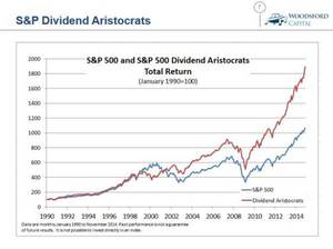 上图显示的是标准普尔红利指数(Dividend Aristocrats,红线)和标准普尔500指数(蓝线)的历史回报对比。标准普尔的红利指数中的成分都是标准普尔中分发红利比较高的公司。如果从1990年开始算起截至到2014年,那么红利指数的回报要远远高于市场平均回报。当然,这个更高的回报也不是每年必然。比如从上图中我们可以看到,在1998-2001年间,红利指数的回报是低于市场平均回报的。