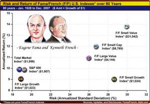 上图显示的是Fama和French对美国股市做的从1928年到2007年的接近80年历史的回测。在这80年的股票历史回测中我们可以看到,平均股票市场回报为每年10%左右(上图中蓝色TM圈),小股票的平均回报(SC天蓝色圈)为每年12%左右,大型价值股票(上图中紫色LV圈)平均年回报11%左右。如果将两者叠加,小型价值股票(SV,上图右上角圈)的年回报为14%左右。