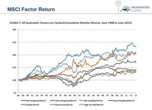 需要指出的是,所有这些能够带来超额收益的回报因子,其带来的超额回报并不是稳定不变的。比如上面图中显示了MSCI World Index从1988年到2013年的不同因子的回报。大家可以看到,这些因子的回报可谓风水轮流转。比如价值(Value)因子(上图红线),在1996-1999年表现差强人意。动量(Momentum)因子(上图土黄线),在2007-09年遭受重大打击。